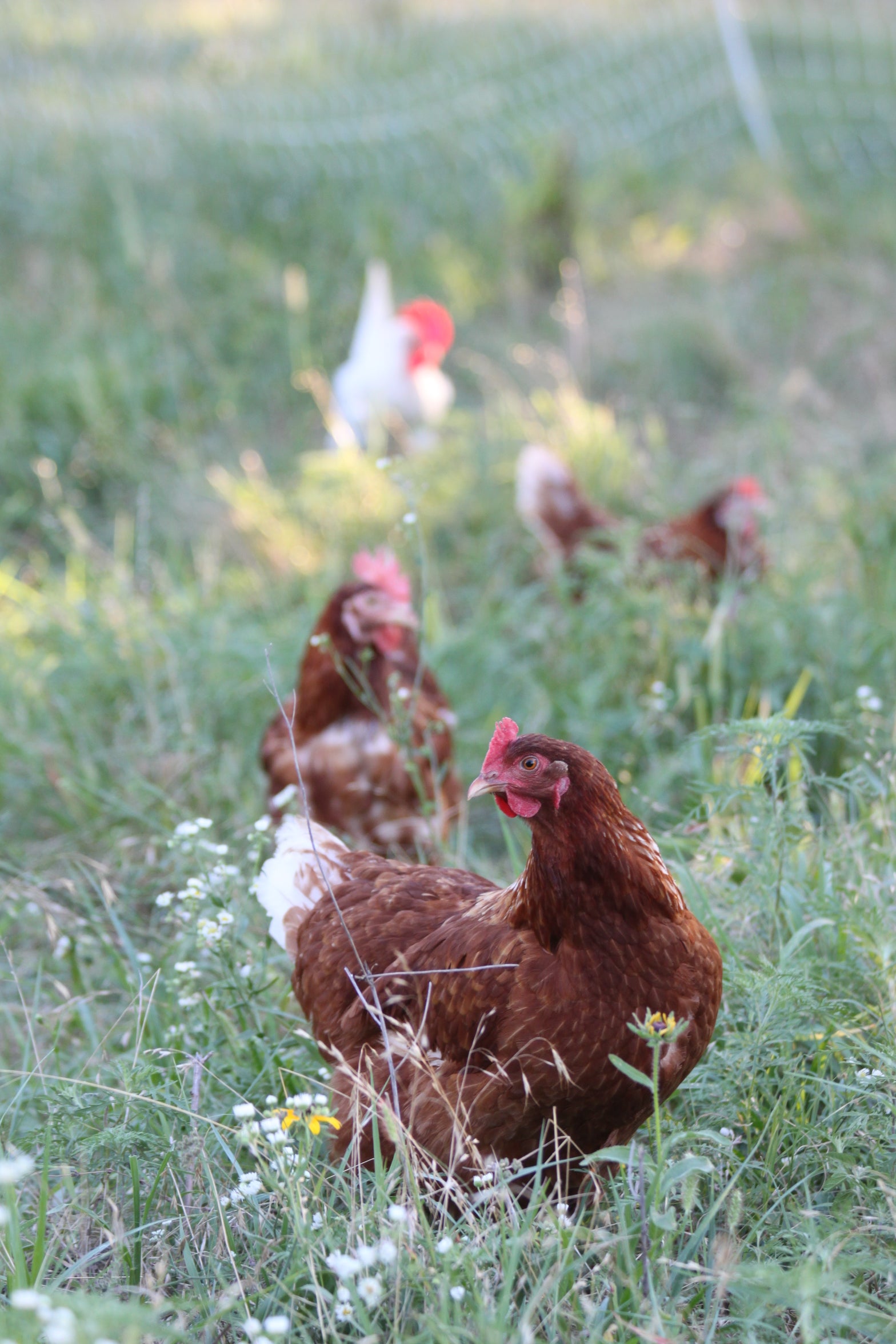 Hedge Valley Farms laying hens are guests of the Cackleberry Castle, our portable henhouse on wheels. The chickens scratch through the grass, eating newly exposed insects like grasshoppers, crickets, and worms. We move them to fresh pasture every few days, depending on weather to cover as much ground as possible. They follow the cattle herd to spread manure and eat protein-rich larvae. They are supplemented with local grains.