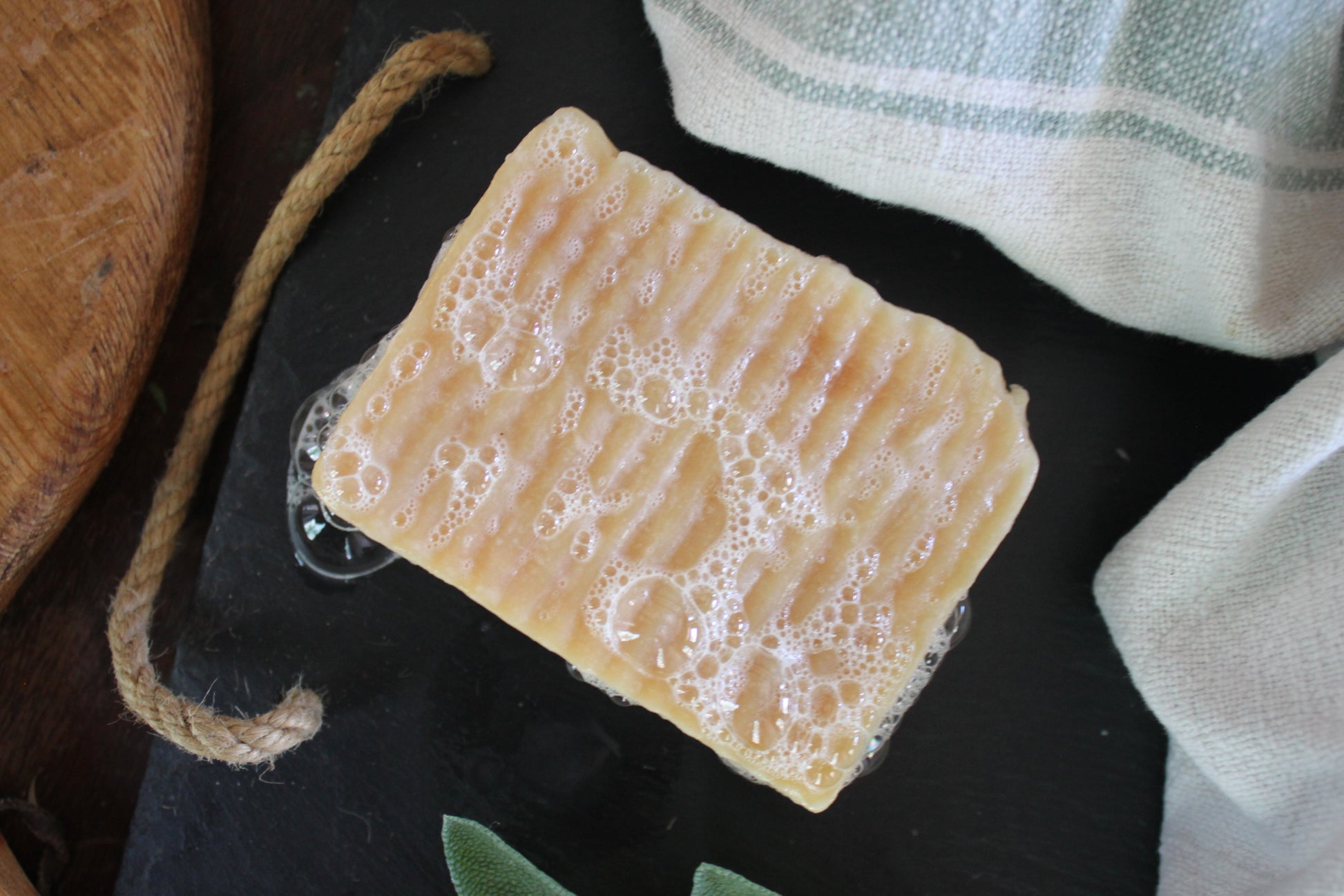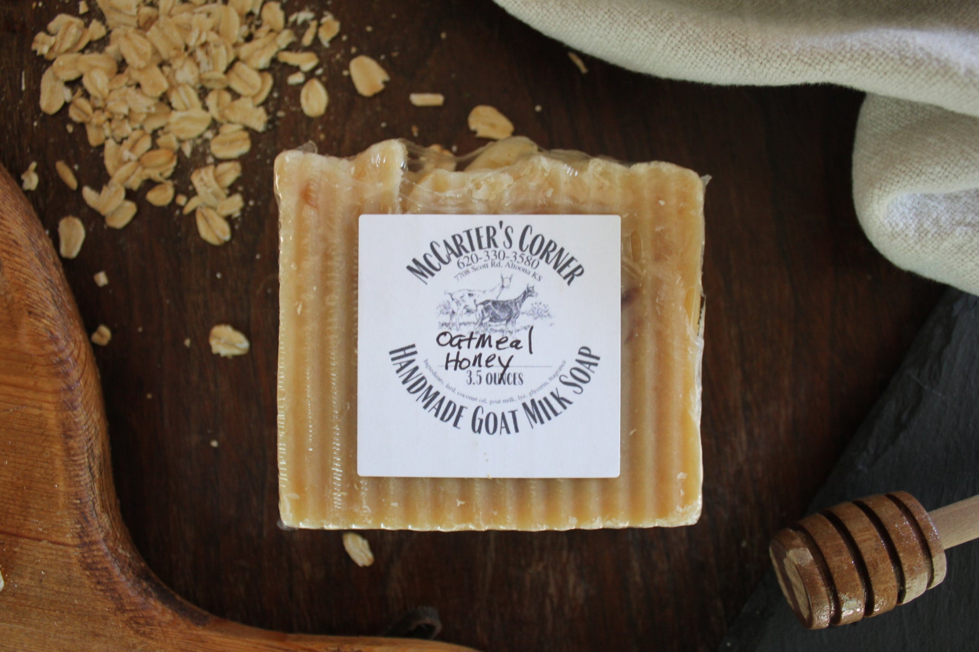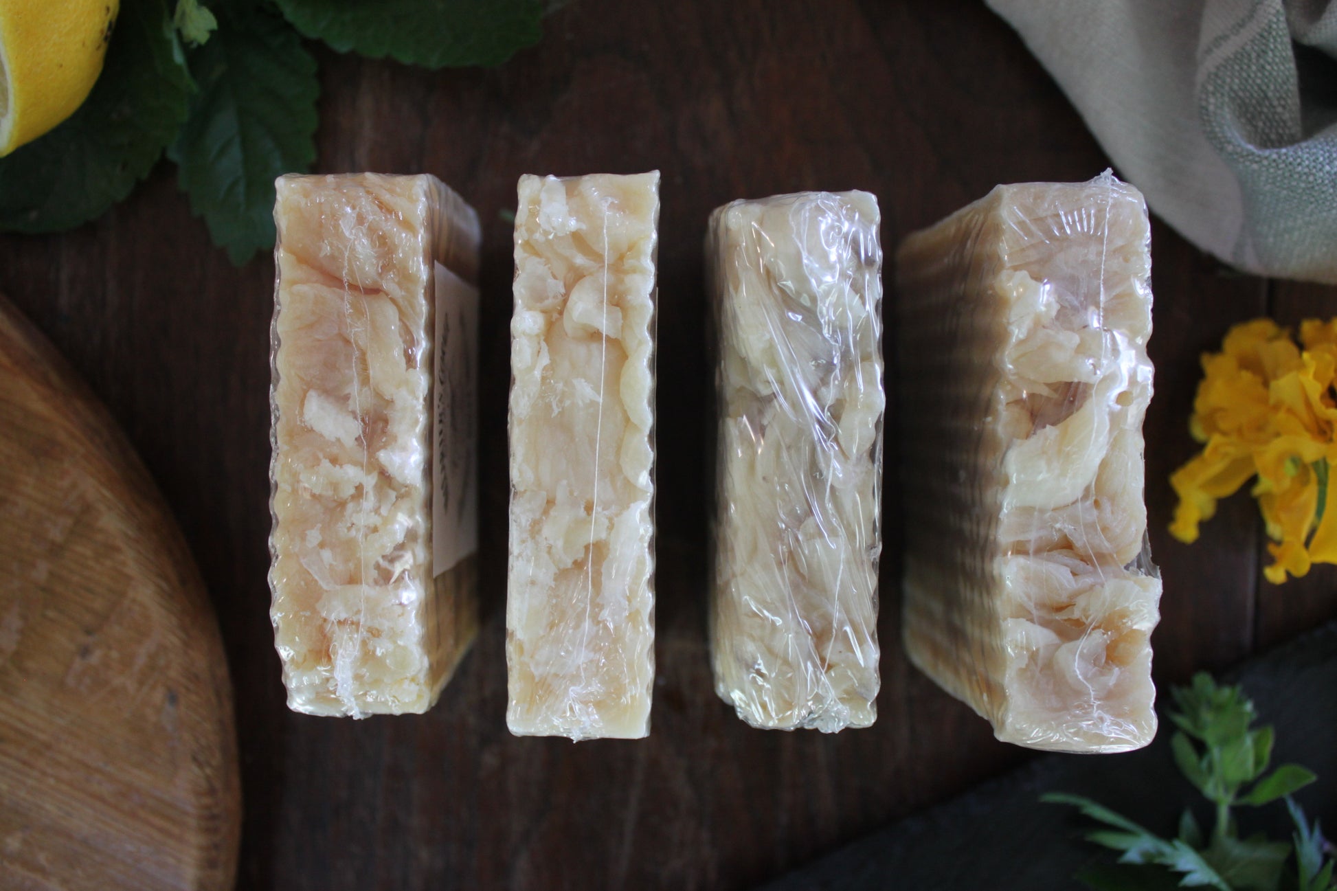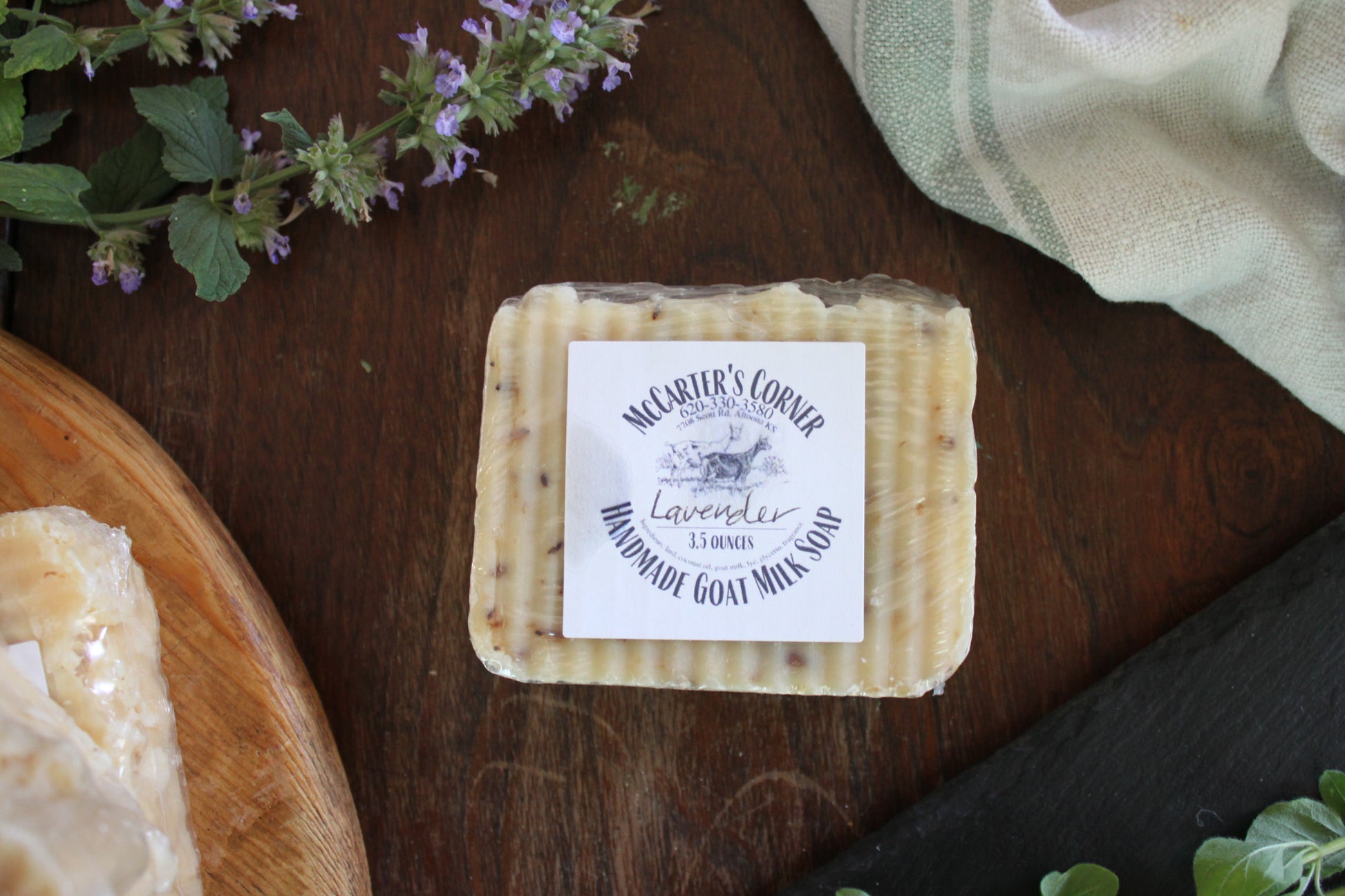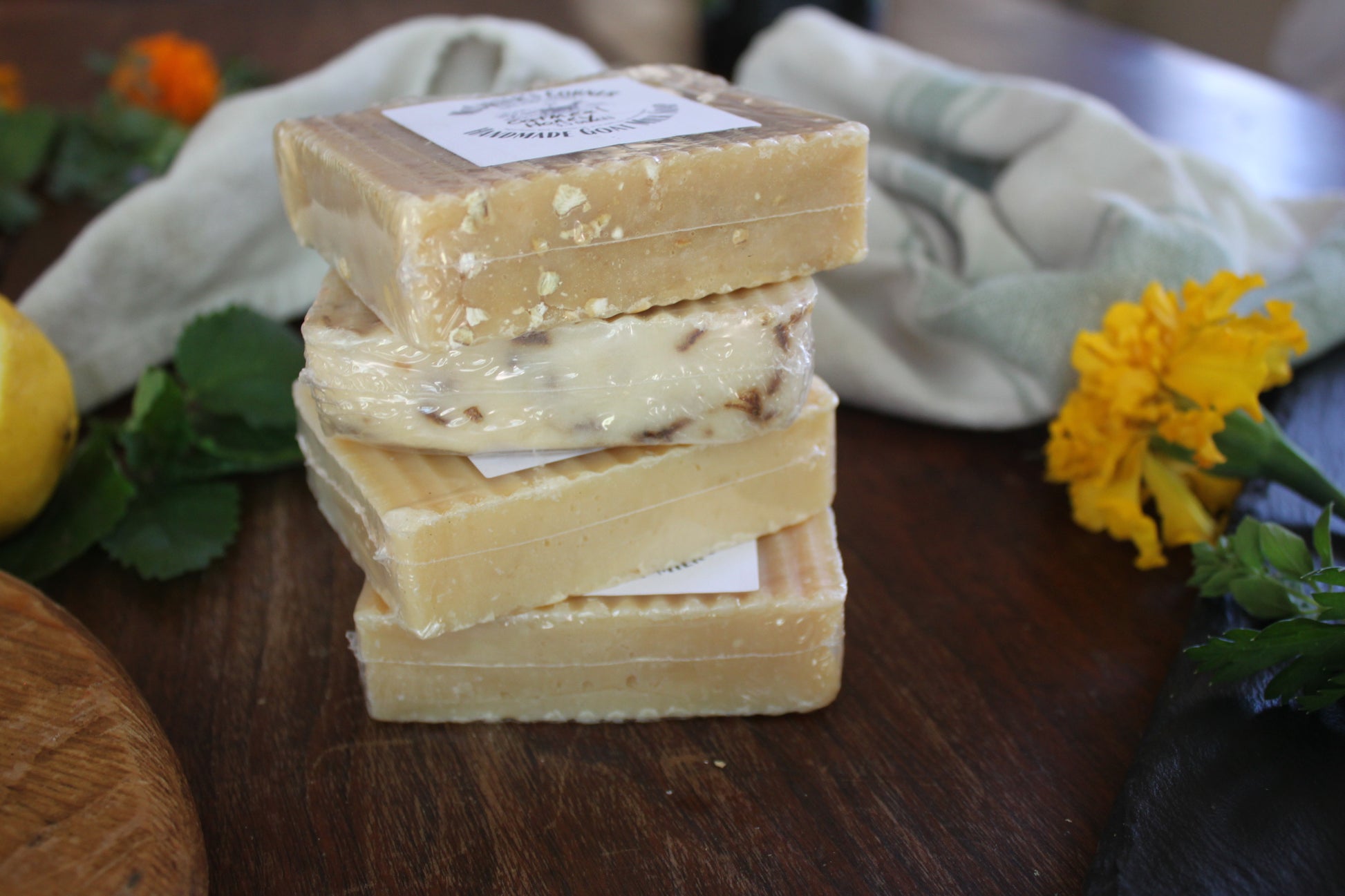 - Goat milk soap bars are made by hand on-farm in small batches.