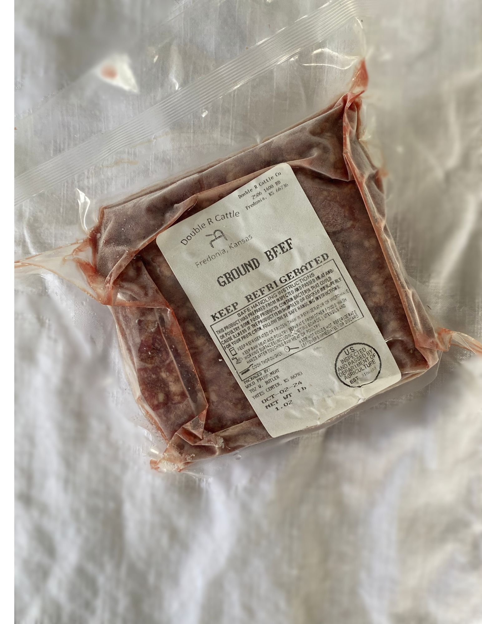 Ground beef is grass-fed, grain-finished, and packaged in 1- or 2-pound portions.